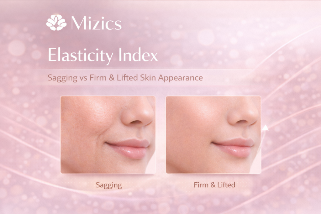 Mizics analyses contour transitions, surface smoothness, and visual firmness cues across visible skin areas. By examining how skin appears to respond to natural contours, the system estimates elasticity-related appearance characteristics.